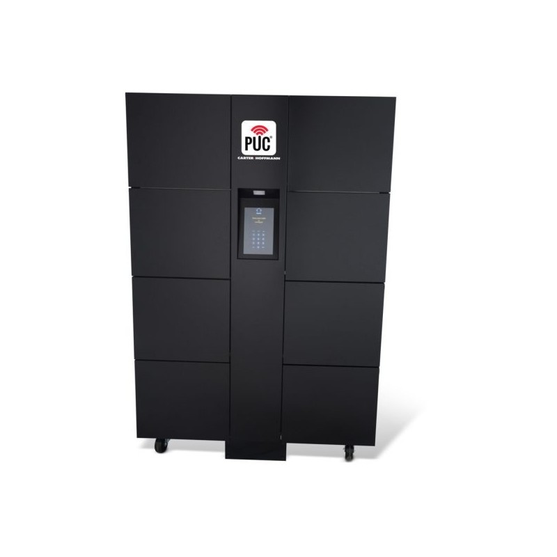 Material Stainless Steel. Capacitive touchscreen tablet with QR code scanner. Silicone pad heaters; adjustable plate temperature range from 60C to 82C. Pop-latch, auto-open doors. Software includes order management, programmable residence time alarm, customer notification and cleaning cycle notification. WiFi connection required. 8 lockers.