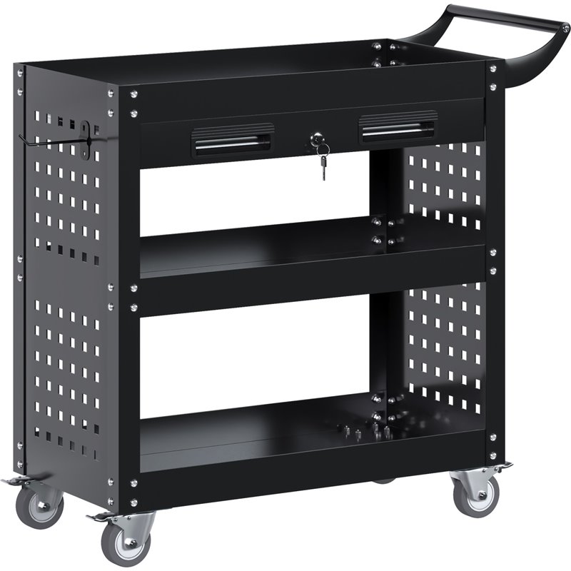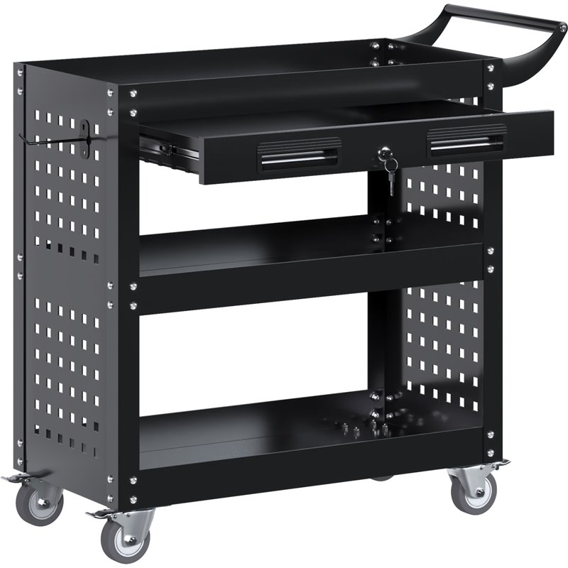 This commercial black tool carthas three tiers and features a drawer to store small parts. Constructed from steel, this trolley has a generous depth of 350mm and fetures 4 castors. The pegboard sides allow hooks to be added for further storage. Ideal for any warehouse or garage at this discounted price.