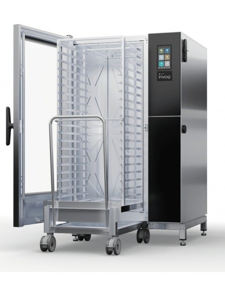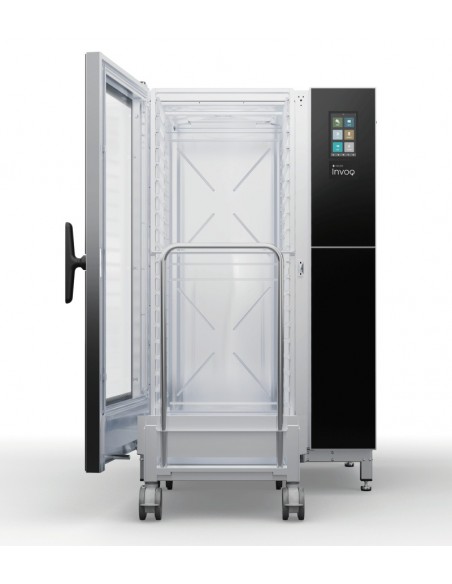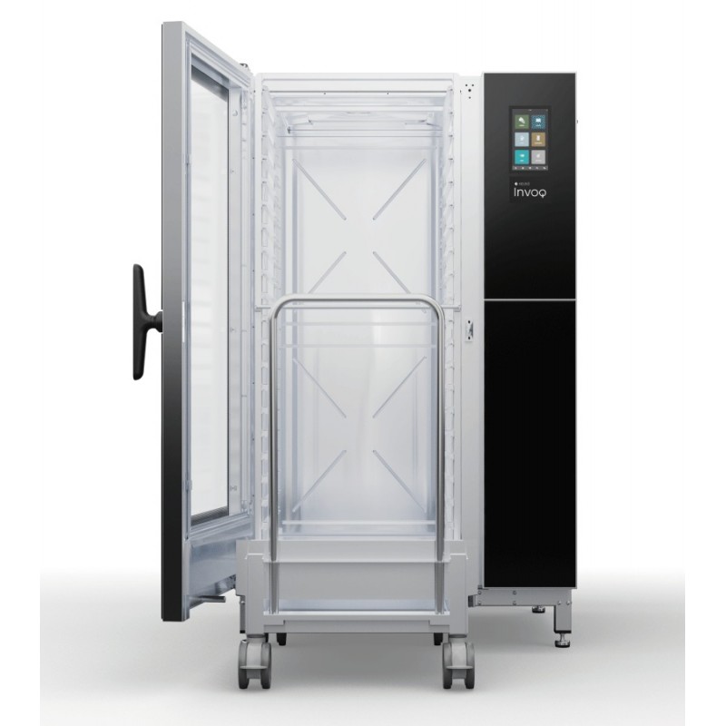 The Invoq Hybrid is the perfect kitchen appliance, where all the latest technologies have been made simple for you to use. The 20-2/1 GN model offers a combination of an energy-efficient boiler with an injection steam system. Together with smart sensors and integrated drain and inlet systems the oven delivers fast, efficient and safe high-density steam saturation – perfect for intensive steaming production. The roll-in system gives you safe and efficient operation for increased productivity, as well as good ergonomics with a maximum working height of 1.6m. The steam production and the automated cleaning system are controlled to utilise a minimum of energy and water without ever compromising quality results.
