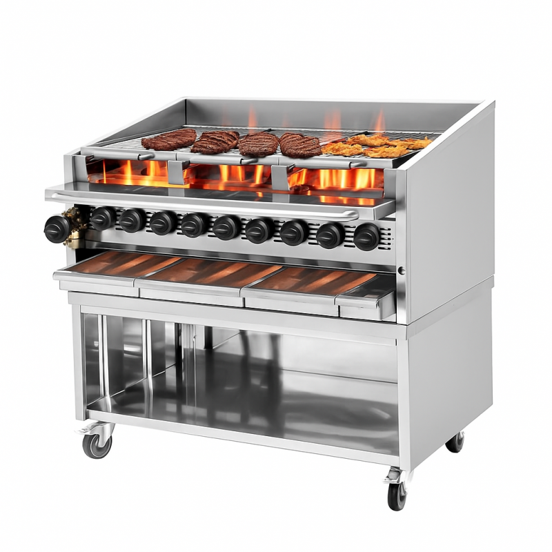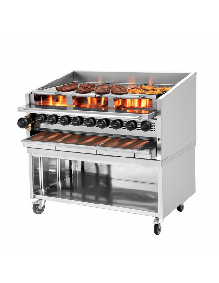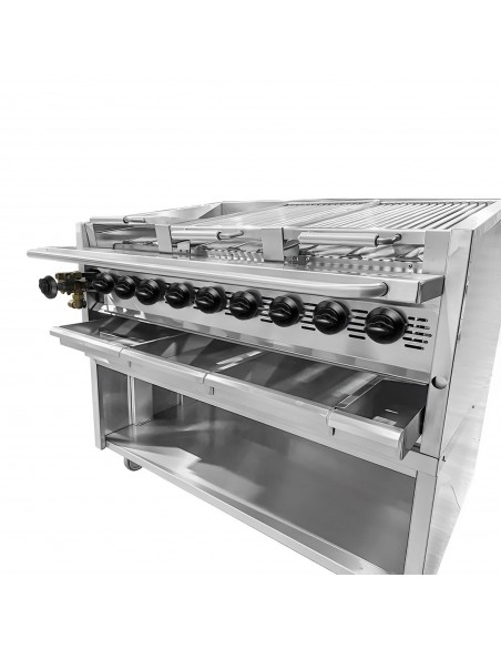 Equipped with 9 high-performance burners, this heavy-duty chargrill delivers exceptional heat distribution across the cooking surface, ensuring consistent results whether you’re grilling steaks, burgers, chicken, or seafood. Perfect for restaurants, steakhouses, catering kitchens, and food trucks, it combines power with durability in a sleek, stainless steel design.