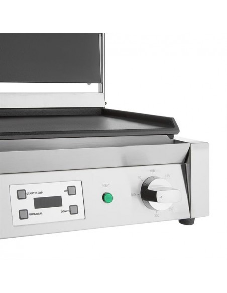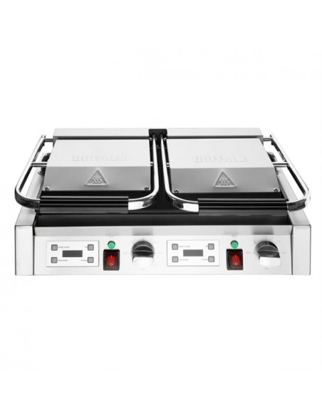 With its rapid heat-up and generously-sized enamelled cast iron grilling surface, the Buffalo extra large double contact grill is a powerful and reliable addition to professional kitchens. Perfectly designed to produce great tasting food, the grill features independent accurate temperature controls and programmable digital timers for each side, so you'll always get consistent results, whether you're making traditional breakfasts or tempting takeaway snacks.