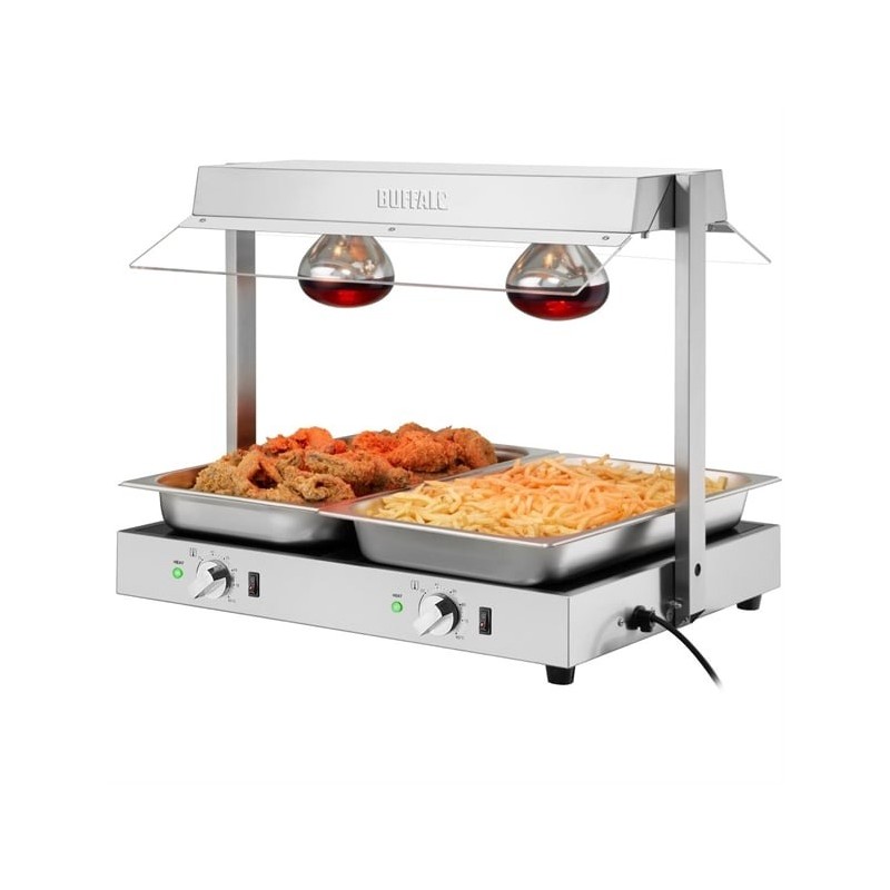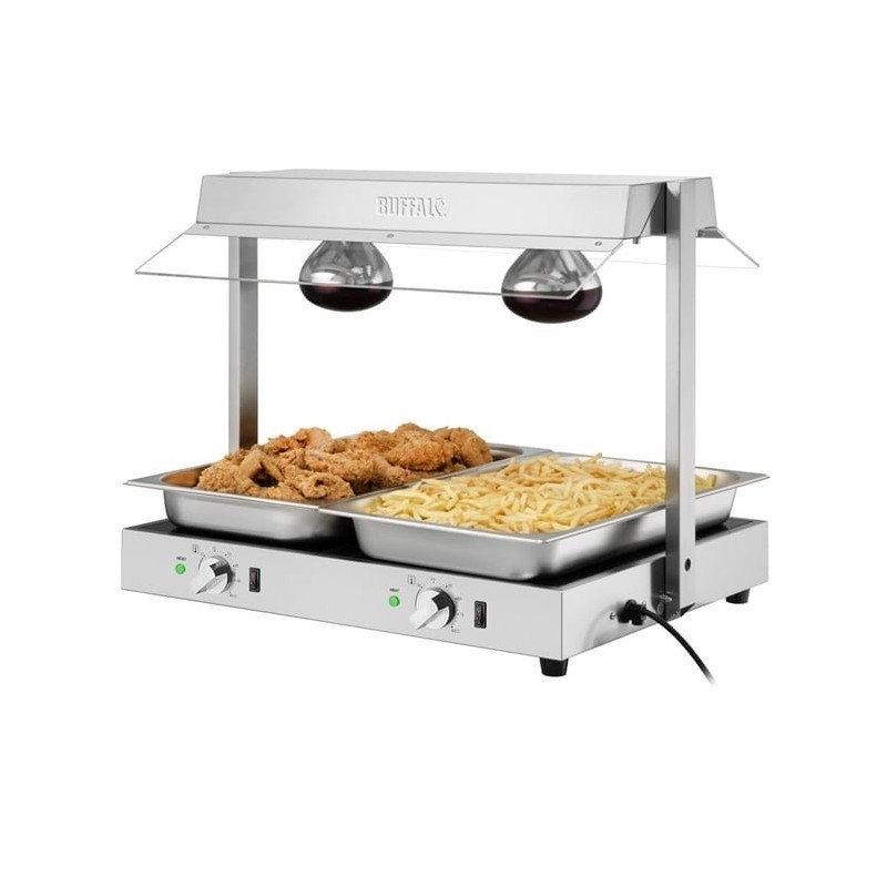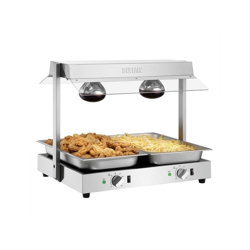 This model features two plates with overhead bulbs and can accommodate up to full-size (1/1GN) gastronorm food trays at a time. As an added extra, the Buffalo food warmer is supplied with the bulbs as standard, so you can install the unit straight away.