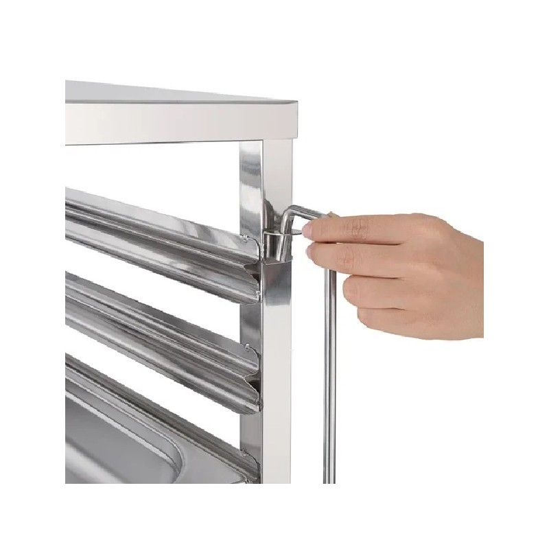 This 6-tier rack trolley is a practical solution for organizing and transporting pans efficiently, making it ideal for bakeries, catering businesses, and professional kitchens. Thanks to the four strong castor wheels, manoeuvring full loads is effortless, and the front braked castors offer complete control when navigating the trolley through tight spaces or uneven surfaces. Additionally, the robust stainless steel construction guarantees durability and comes with bumpers for extra protection against bumps and knocks.