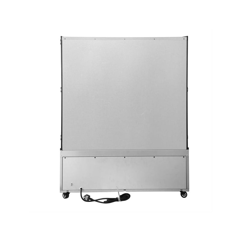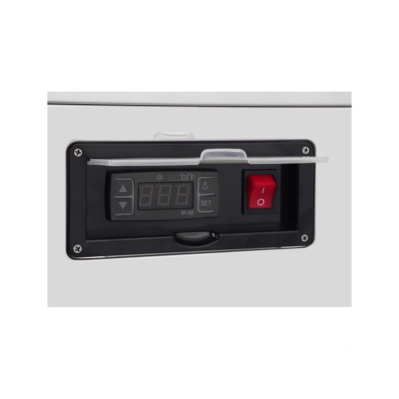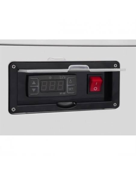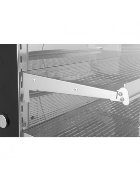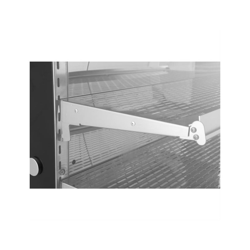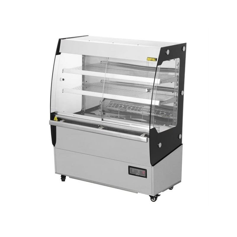 The Buffalo merchandiser offers plenty of display space over two adjustable shelves, with access via two sliding doors. The doors not only help to keep more heat inside the display, they also help to reduce overall running costs and improve hygiene. Internal temperatures are easily adjusted using the intuitive digital controller. It's easy to position and clean too, thanks to the merchandiser being mounted on castors (two braked). Uses a single 13A plug for power.