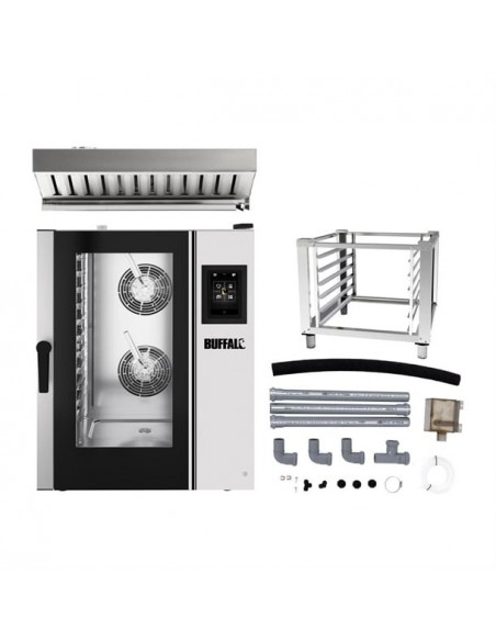 Once you're all done, cleaning is simplified too. Simply set the automatic one-touch washing mode to run and the Buffalo combi oven is left sparkling clean, ready for the next use. Includes stand, hood and installation kit.