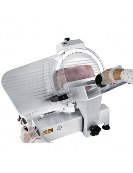 Save time and reduce waste with the powerful and reliable Buffalo commercial meat slicer. With its large 300mm blade with integral sharpener, you can easily and precisely slice large quantities of beef, ham, poultry or vegetables with the minimum of mess and fuss.