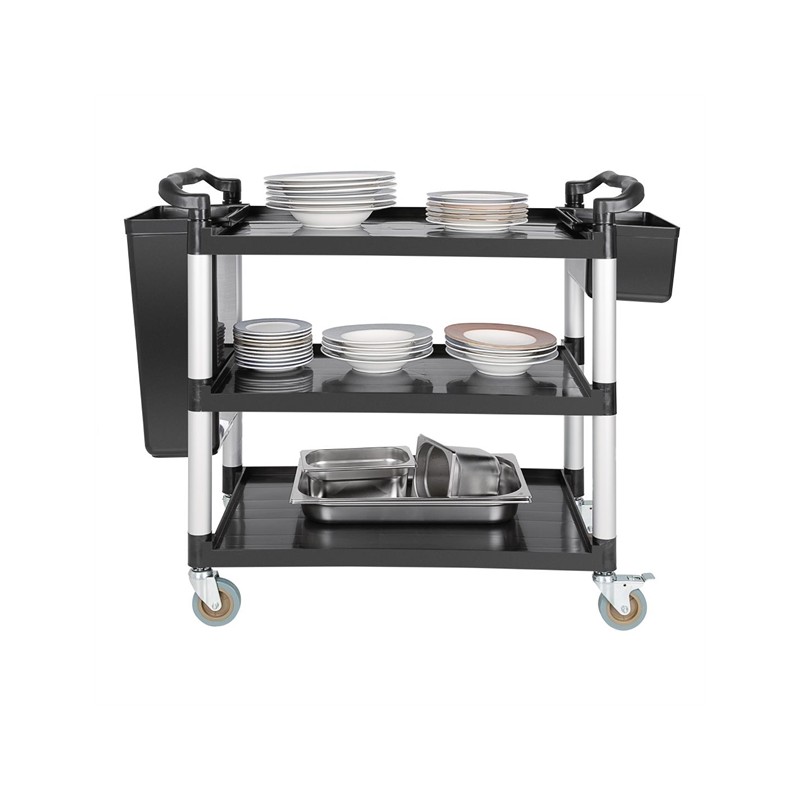 Sturdy framed tough polypropylene utility trolleys that have the durability for many applications throughout hotels restaurants and other establishments. Clip on refuse and cutlery bins, crockery and pans available and sold separately.