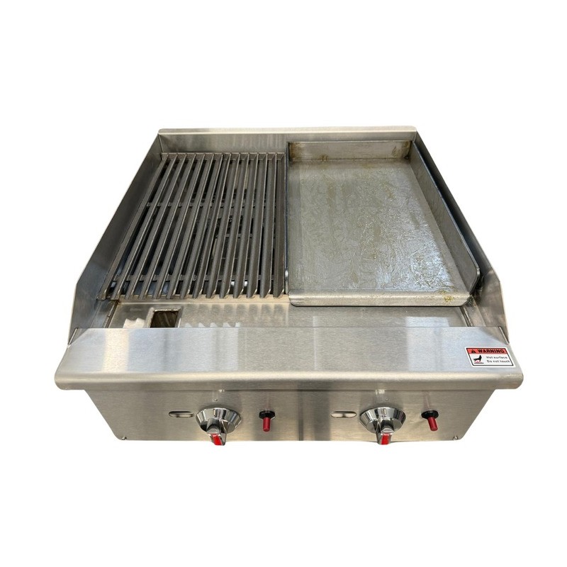 The charbroiler surfaces are stainless steel in the front and galvanised sides and back that retain and distribute heat evenly for consistent cooking results. Equipped with large oil collectors at the bottom, zinc alloy knob with chrome coating, these appliances are designed to withstand the rigors of a commercial kitchen environment.