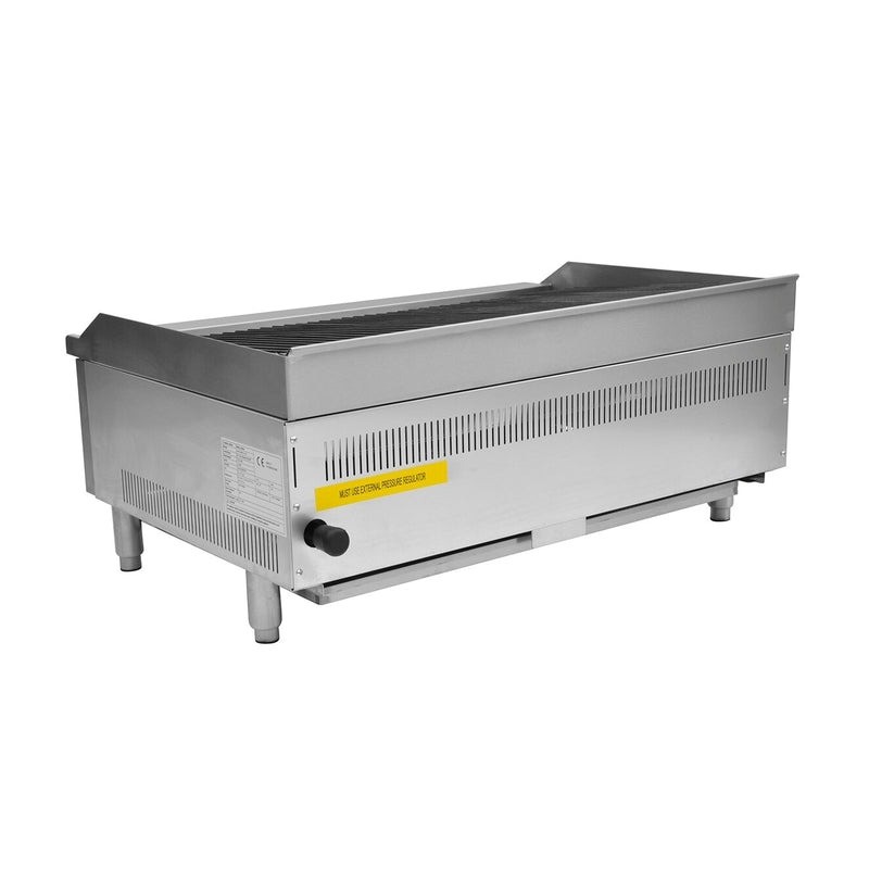 The charbroiler surfaces are stainless steel in the front and galvanised sides and back that retain and distribute heat evenly for consistent cooking results. Equipped with large oil collectors at the bottom, zinc alloy knob with chrome coating, these appliances are designed to withstand the rigors of a commercial kitchen environment.