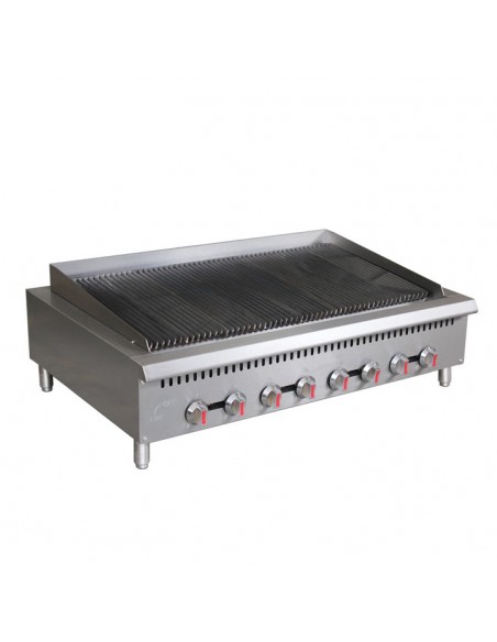 These heavy duty, compact, and efficient cooking devices feature gas-powered cast iron bar burners (each 20,000BTU/hr) positioned beneath a grate or grill surface to direct heat toward them, and are controlled every 12” width. They are specifically engineered for high-temperature grilling and searing, making them ideal for cooking various foods such as steaks, burgers, chicken, seafood, and vegetables.