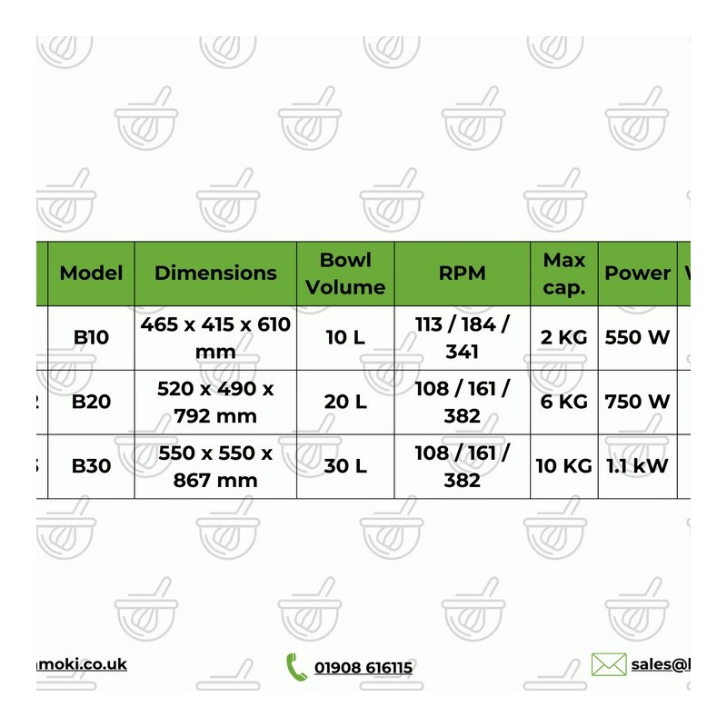 - Includes flat stirrer, dough hook, whisk