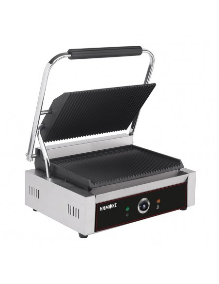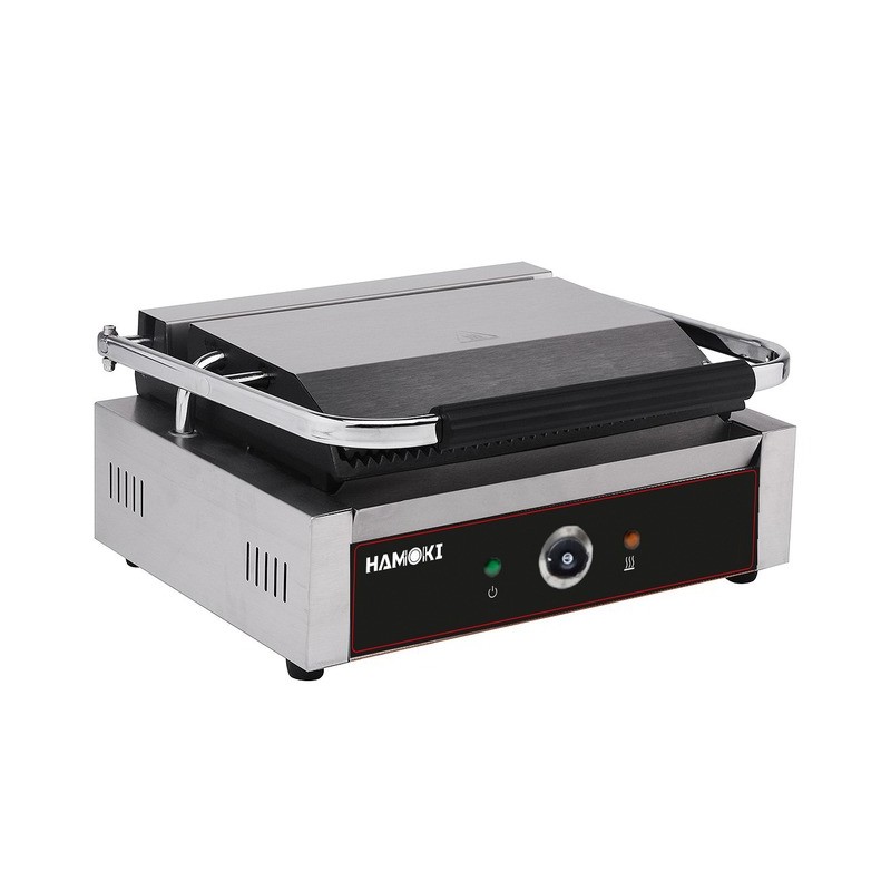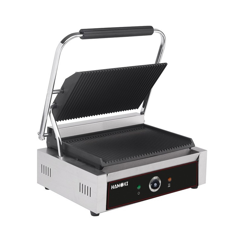 The Hamoki Contact Grill is a great value Bistro Contact Grill. It has a robust, stainless steel structure with ribbed cast iron plates for long-term usage and grilling, perfect for burgers, steaks, paninis and toasted sandwiches in busy restaurants. You have complete control over the entire grilling process with an adjustable swivel head and a changeable heat knob for varied thicknesses and temperatures.