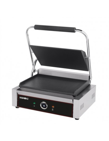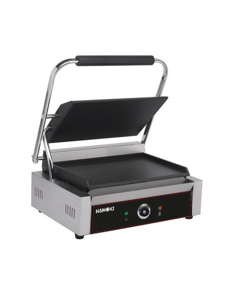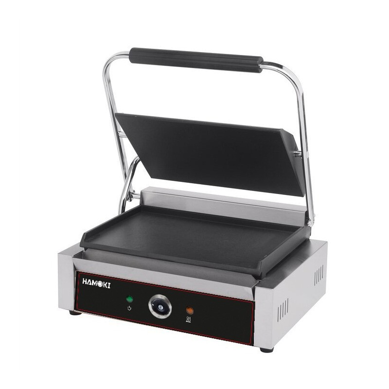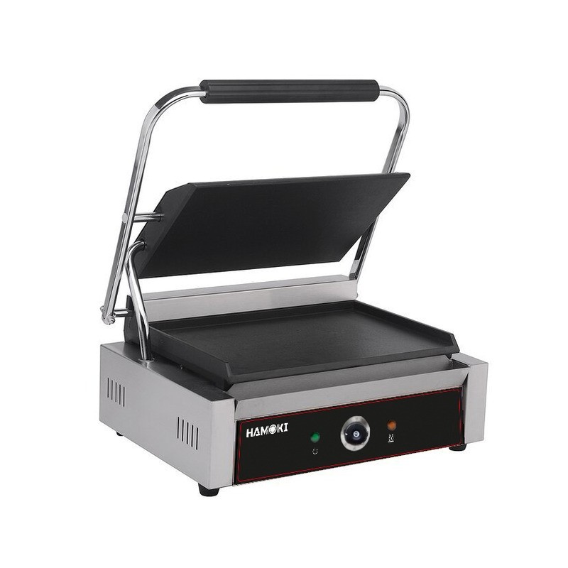 The Hamoki Contact Grill is a great value Bistro Contact Grill. It has a robust, stainless steel structure with ribbed cast iron plates for long-term usage and healthy grilling, and it's perfect for burgers, steaks, paninis and toasted sandwiches in busy restaurants. You have complete control over the entire grilling process with an adjustable swivel head and a changeable heat knob for varied thicknesses and temperatures. Also included is a removable grease tray and griddle scraper for easier cleaning.