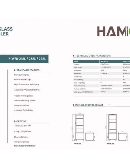 The Hamoki Glass Display Cabinets are versatile and stylish equipment for any food service establishment, such as restaurants, delis, cafeterias, bakeries or even hotels. These compact upright commercial refrigeration units are designed with a front hinged door, back sliding door, and all 4 sides in glass, providing customers and staff easy viewing of the selection available, making it a convenient and enticing way to showcase your menu offerings while protecting from contaminants.
