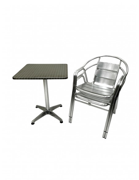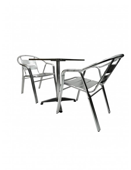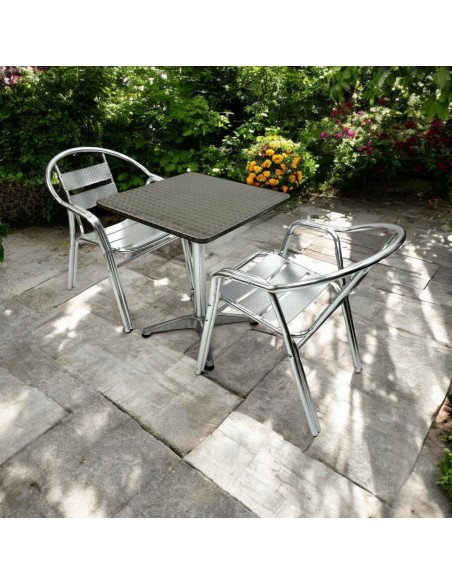 The Aluminium Patio Bistro Set is a stylish and functional outdoor seating option for cafes, bistros, gardens, and pavement seating. The set includes one 60cm square aluminium bistro table and two double tube aluminium chairs. The aluminium construction provides a lightweight and durable option suitable for outdoor use. The bistro table is 60cm x 60 cm, providing ample space for dining and drinks. The chairs are our premium quality chairs and designed to provide added comfortable seating. The set is easy to clean and maintain, making it perfect for high-traffic areas. The sleek design of the set will complement any décor and add a touch of elegance to any outdoor space.