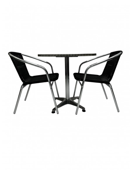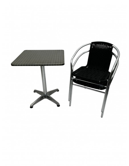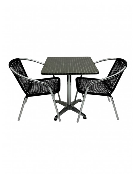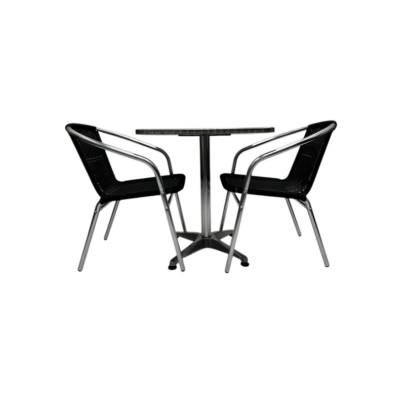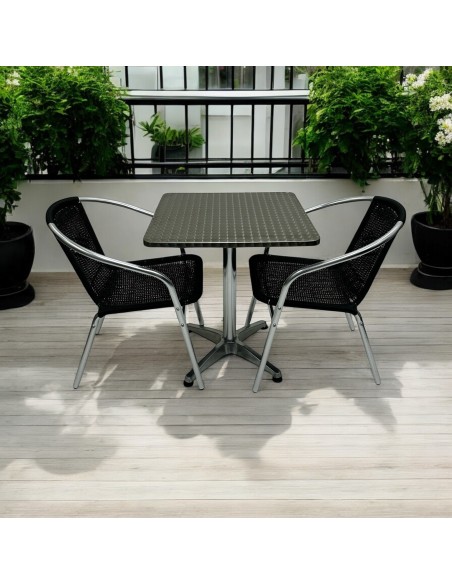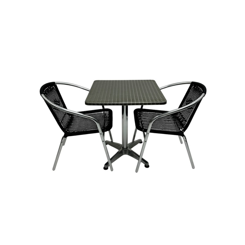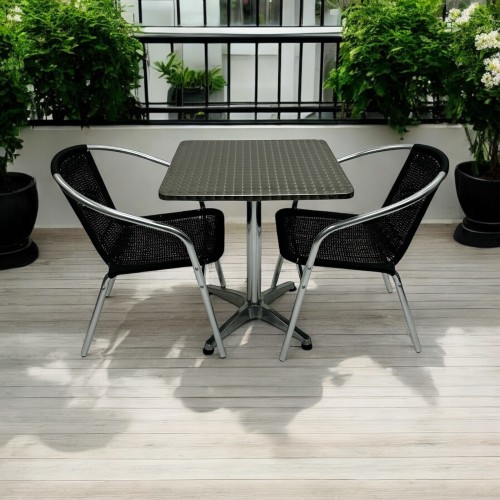 One of our most popular furniture sets, the Rattan Aluminium Garden Set set comprising of one 60cm square aluminium bistro table and two of the black rattan aluminium chairs.