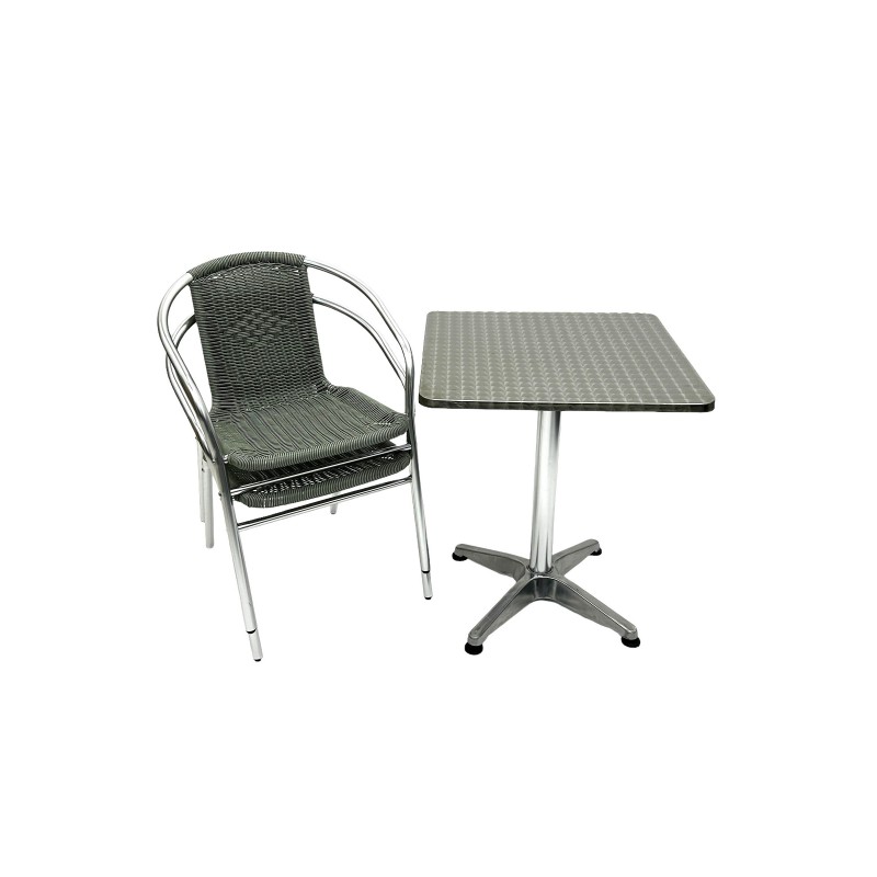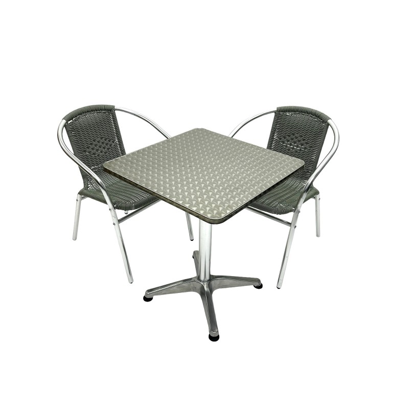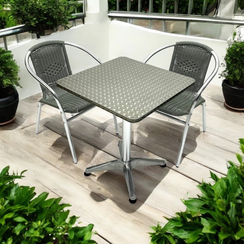 The Square Aluminium Table & 2 Grey Rattan Chairs Set comprising of one 60cm square aluminium bistro table and two of the grey rattan aluminium chairs.