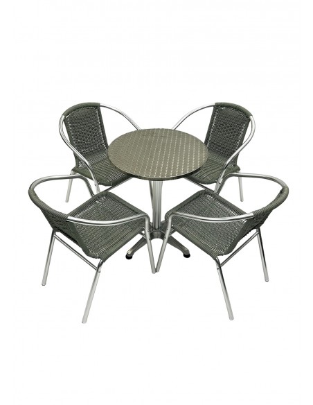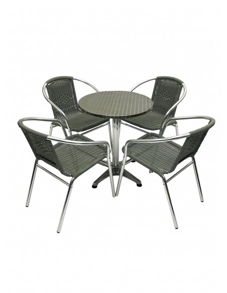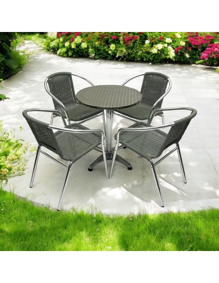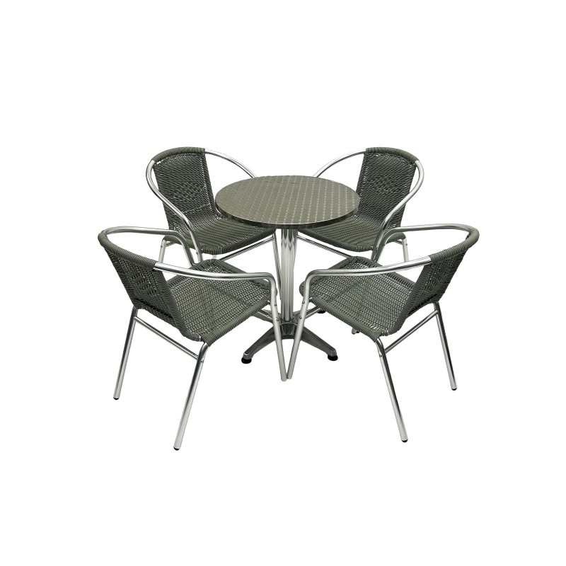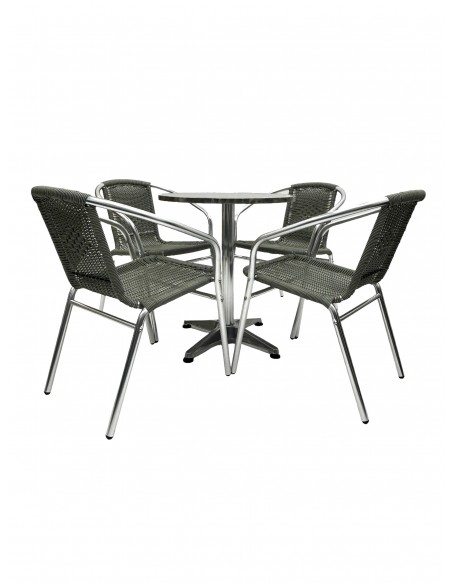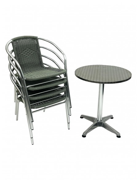 One of our most popular furniture sets, the Round Aluminium Table & 4 Grey Rattan Stacking Chairs Set comprising of one 60cm round aluminium bistro table and four of the grey rattan aluminium chairs.