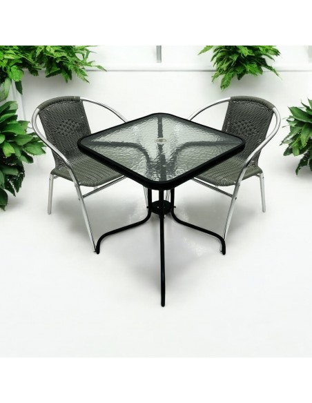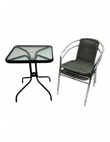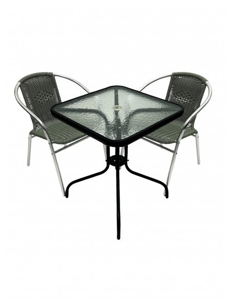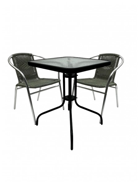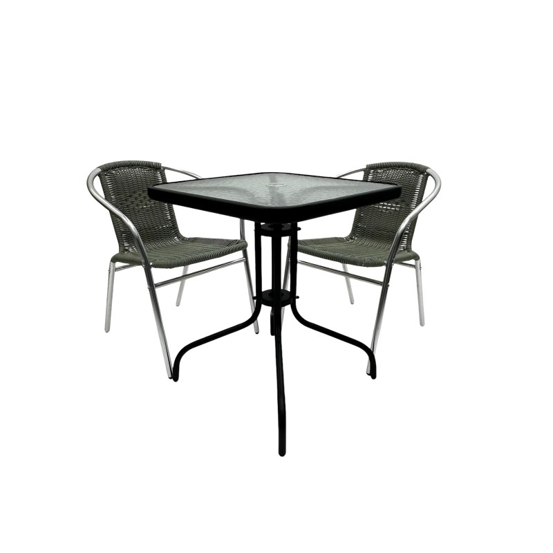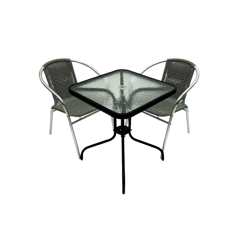 One of our most popular furniture sets, the Glass Table Balcony Furniture Set comprising of one 60cm square glass table and two of the grey rattan aluminium chairs.