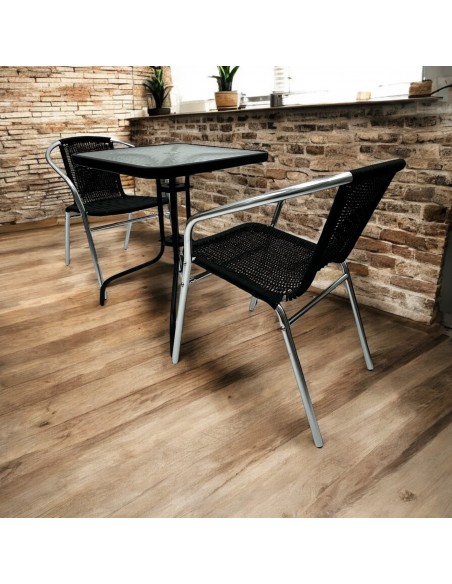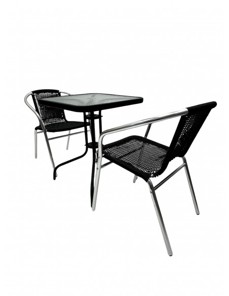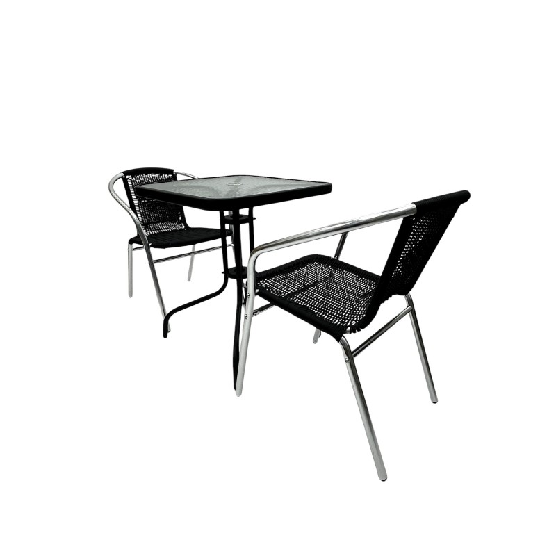 One of our most popular furniture sets, the Glass Table Balcony Set comprising of one 60cm square glass table and two of the black rattan aluminium chairs.