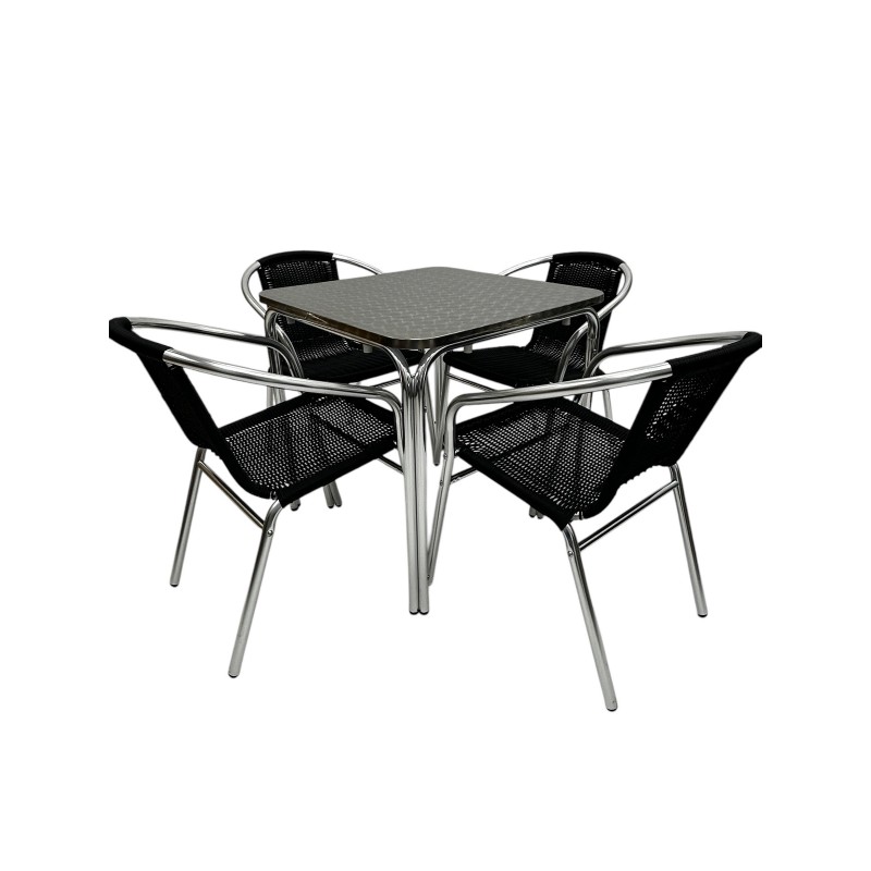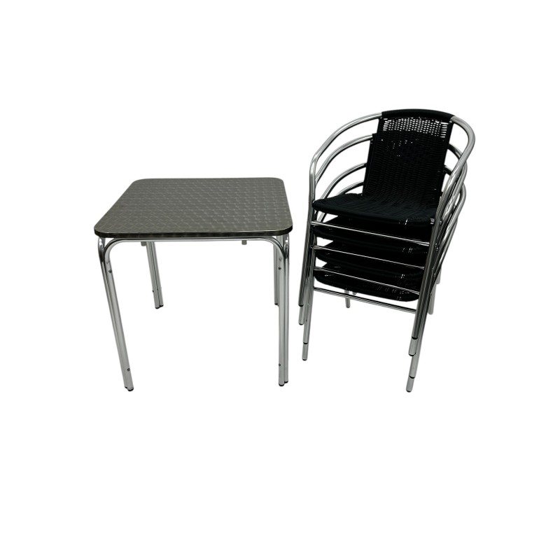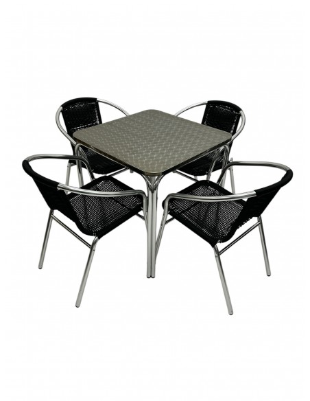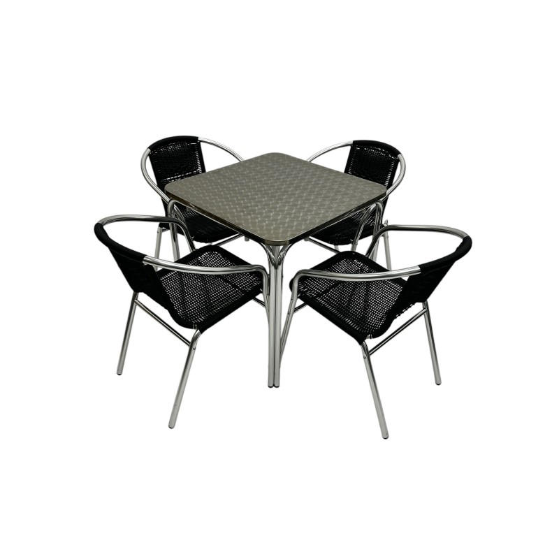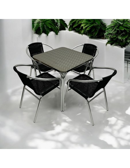 Our BE Furniture Aluminium Rattan Garden Set comprising of one 70cm square aluminium bistro table and four of the black rattan aluminium chairs.