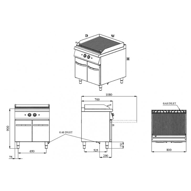 700 Gas Pro Lavastone grill, 800mm wide 2-side grid with open cupboard Natural Gas Chargrill