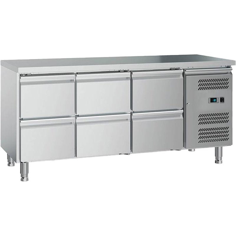 This commercial counter chiller features six solid stainless steel drawers and a range of practical features to streamline operations in any restaurant or catering kitchen. Built for durability and efficiency, it ensures reliable refrigeration while doubling as a sturdy prep surface, making it an essential addition to any professional workspace.
