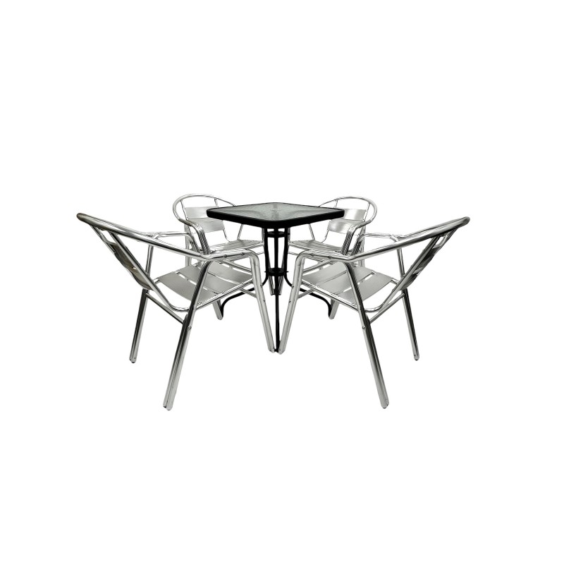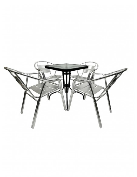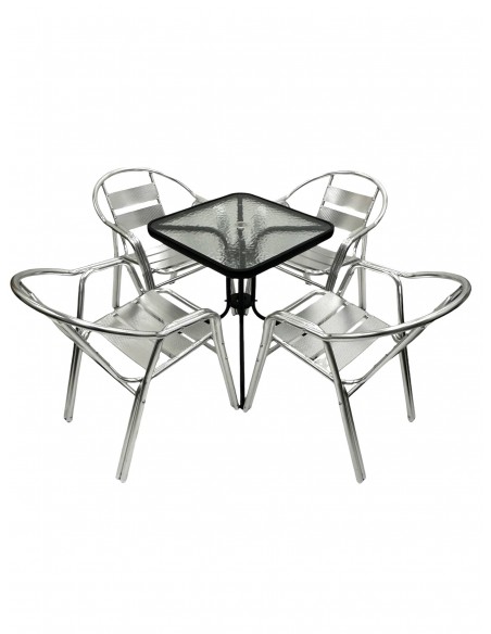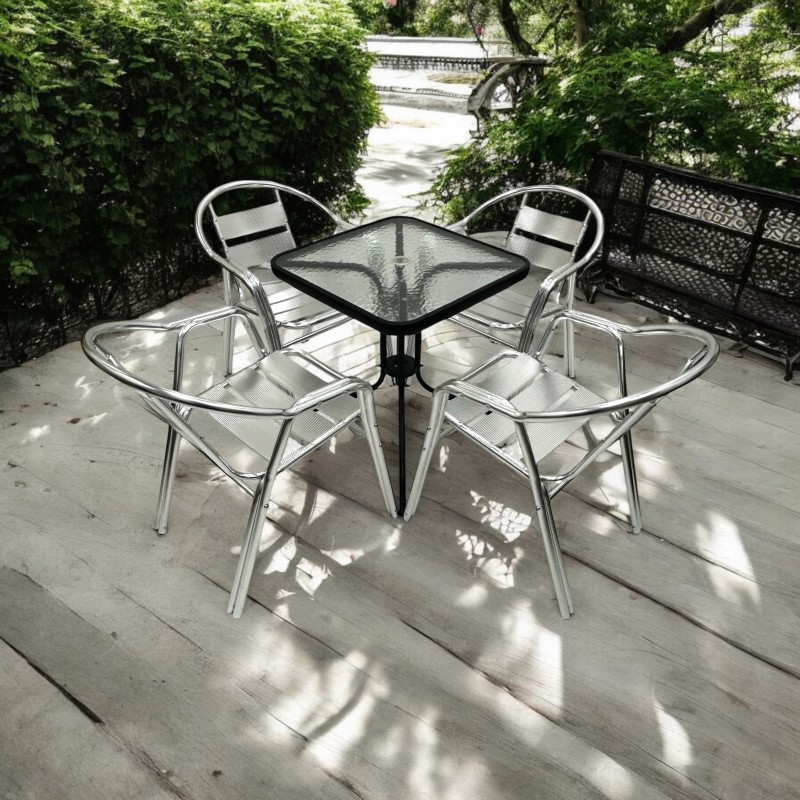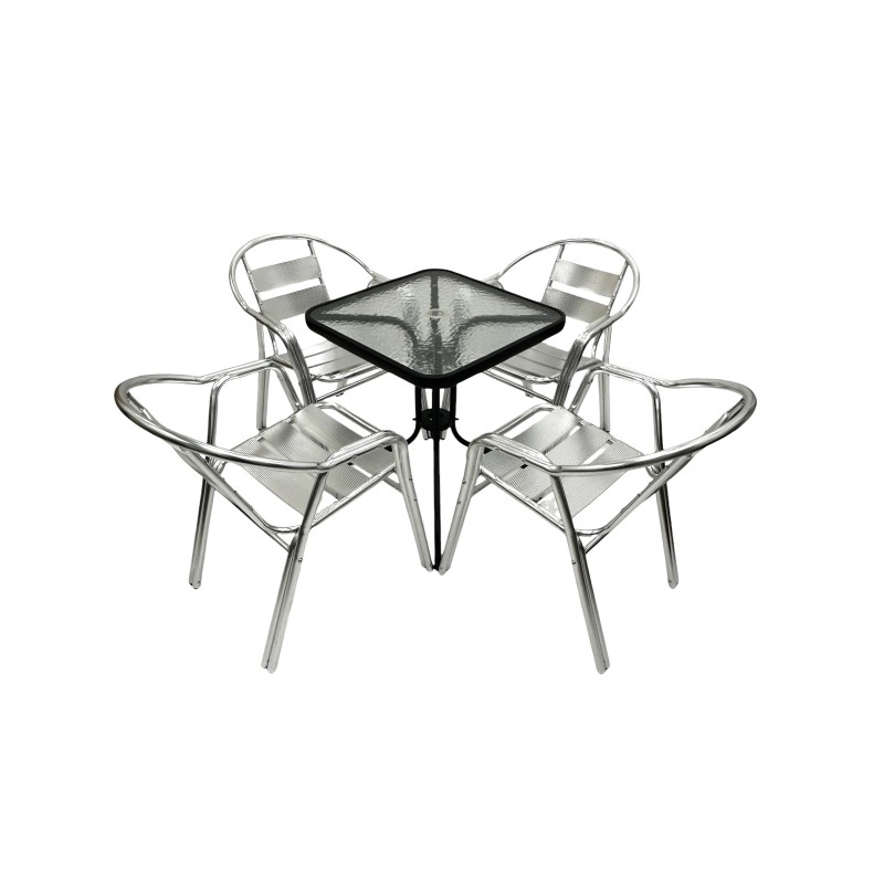 Our premium quality Aluminium Garden Furniture Sets comprising of one 60cm square glass bistro table and four of the premium double tube aluminium chairs.