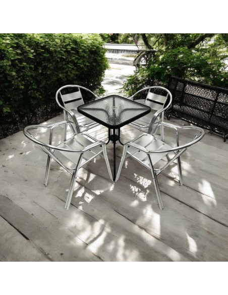 The Aluminium Garden Furniture Sets is a stylish and functional outdoor seating option for cafes, bistros, gardens, and pavement seating. The set includes one 60cm square glass bistro table and four double tube aluminium chairs. The aluminium construction provides a lightweight and durable option suitable for outdoor use. The bistro table is 60cm x 60cm providing ample space for dining and drinks. The chairs are our premium quality chairs and designed to provide added comfortable seating. The set is easy to clean and maintain, making it perfect for high-traffic areas. The sleek design of the set will complement any décor and add a touch of elegance to any outdoor space.