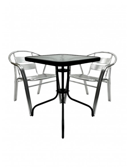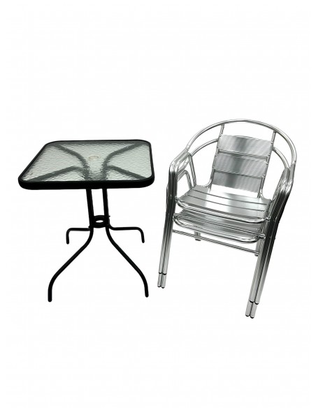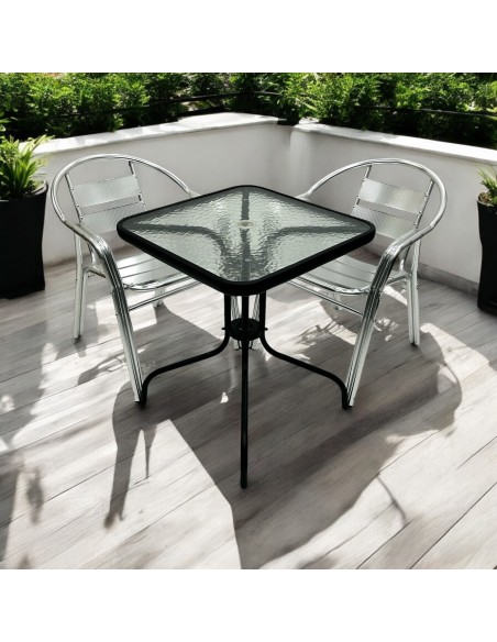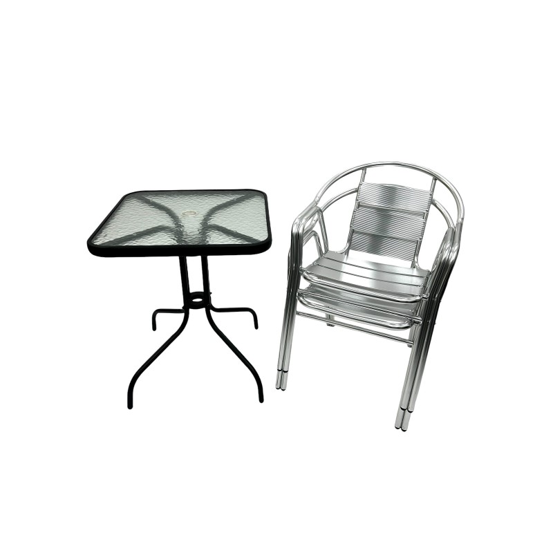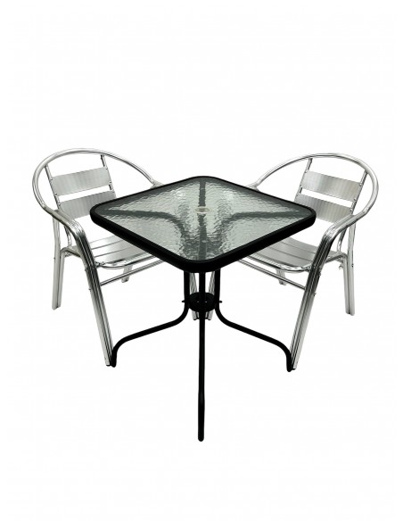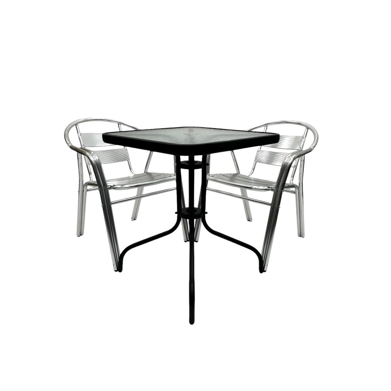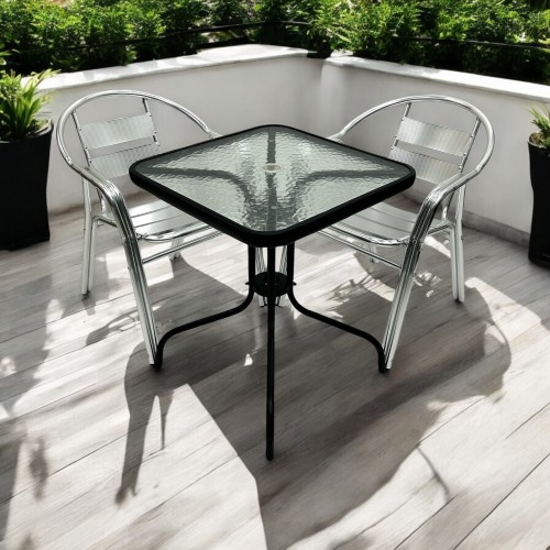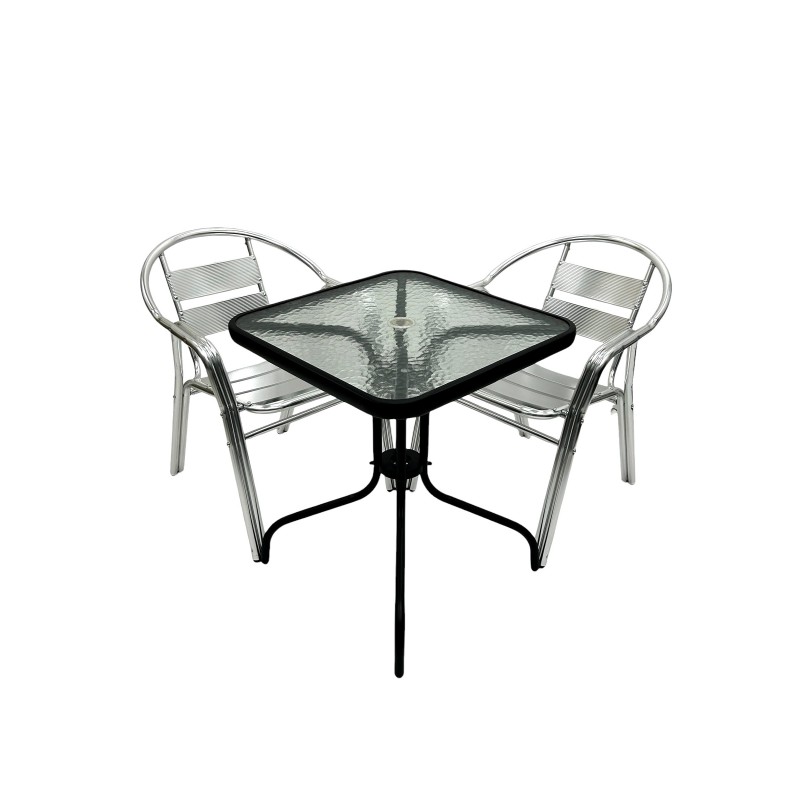 Our premium quality Aluminium Garden Patio Set comprising of one 60cm square glass bistro table and two of the premium double tube aluminium chairs.