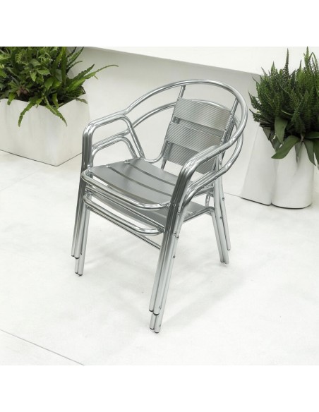 These aluminium bistro chairs are suitable for use in the garden or for cafe’s, fish & chip shops, large sporting events, festivals and restaurants etc. They have plastic feet to prevent scratching the floor. The seat height is 43 cm and they stack tightly for storage.