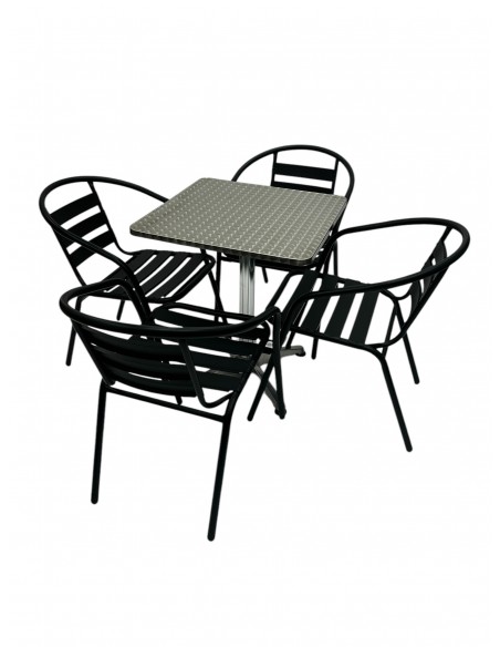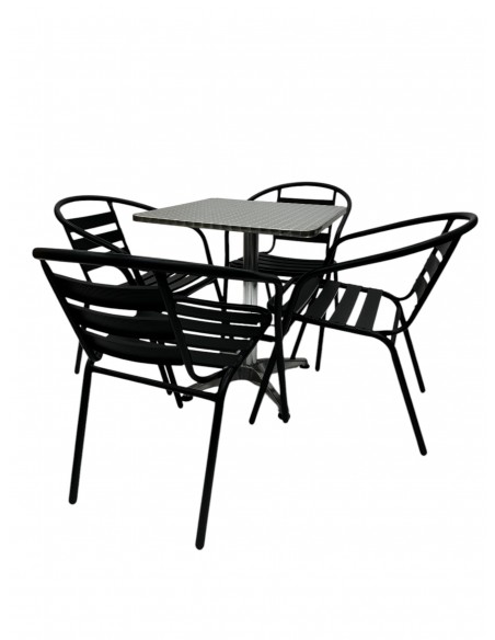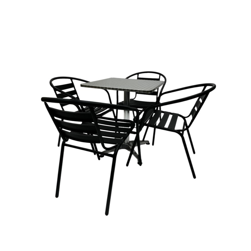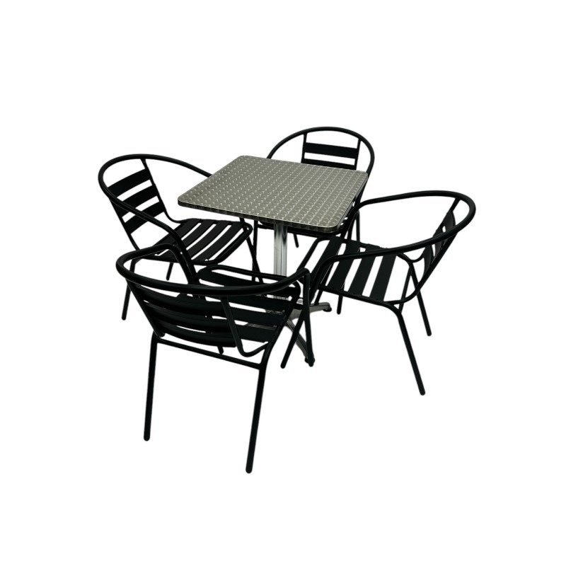 Our Black Steel Garden Set comprising of one 60cm square aluminium bistro table and four of the black steel chairs with black metal slats.