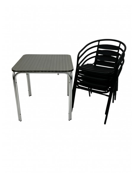 One of our most popular furniture sets, the outdoor Stacking Furniture Set comprising of one 70cm square aluminium stacking table and four of the black steel chairs.