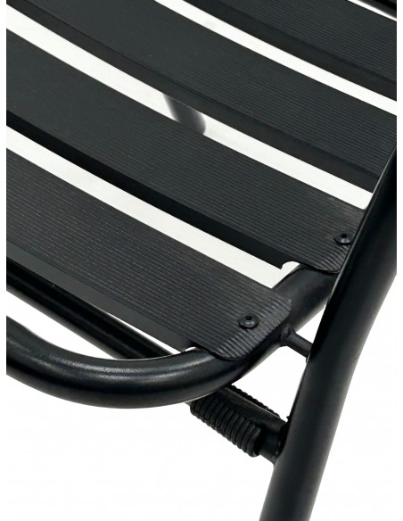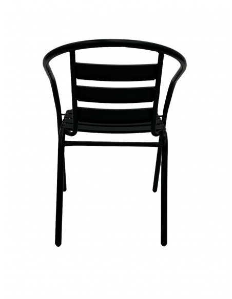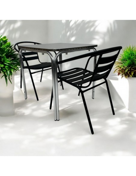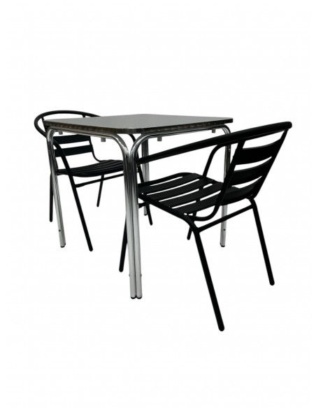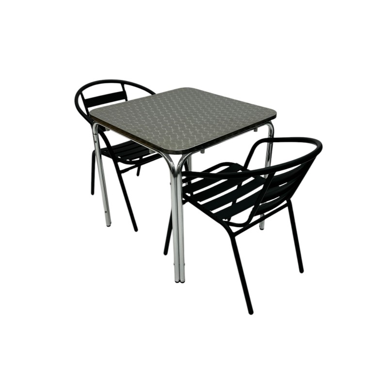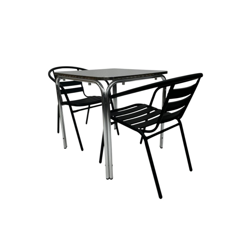 Table for Two Set – Aluminium Stacking Table & 2 Black Steel Chairs
