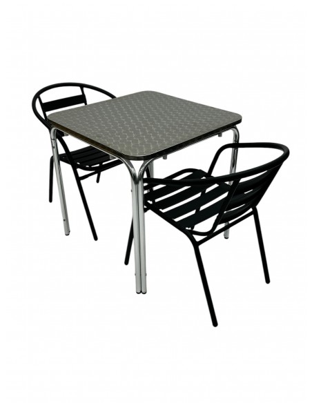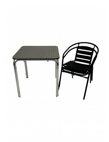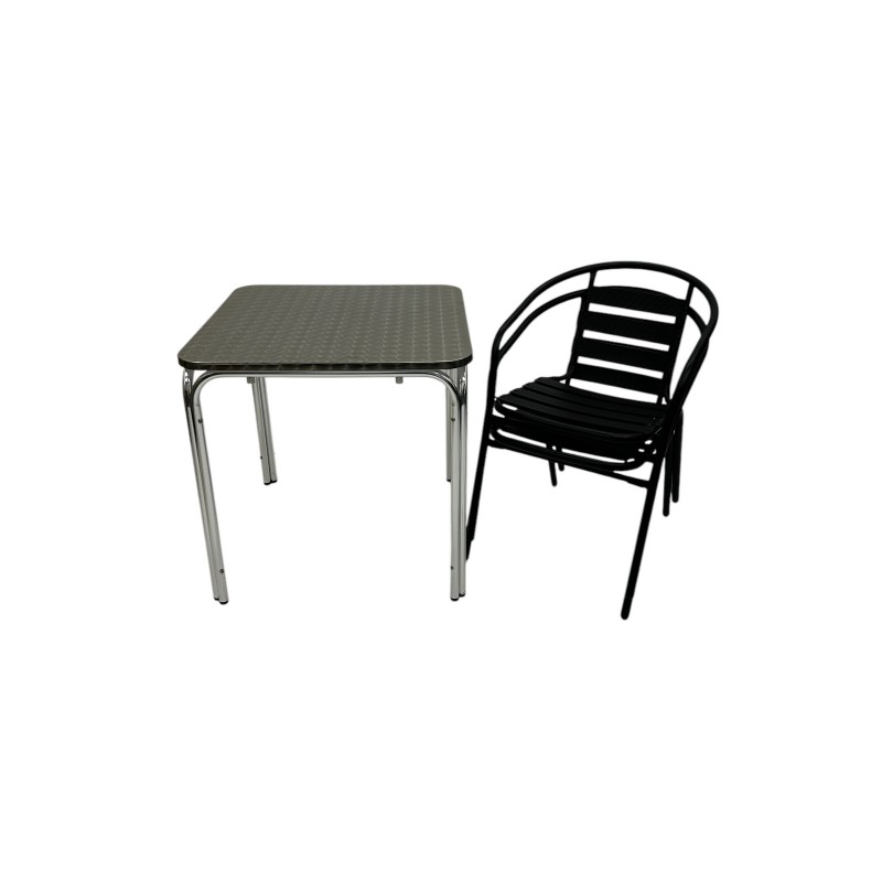 One of our most popular furniture sets, the Table for Two Set comprising of one 70cm square aluminium stacking table and two of the black steel chairs.