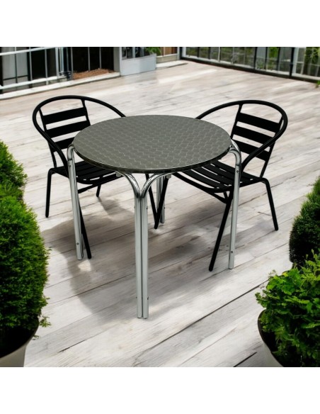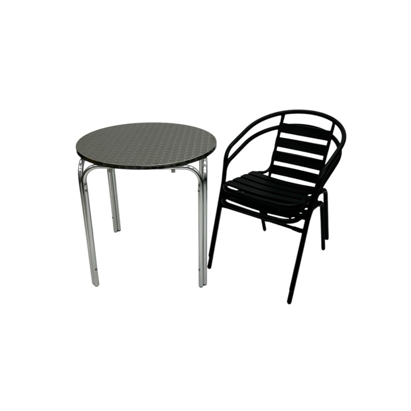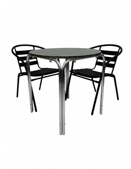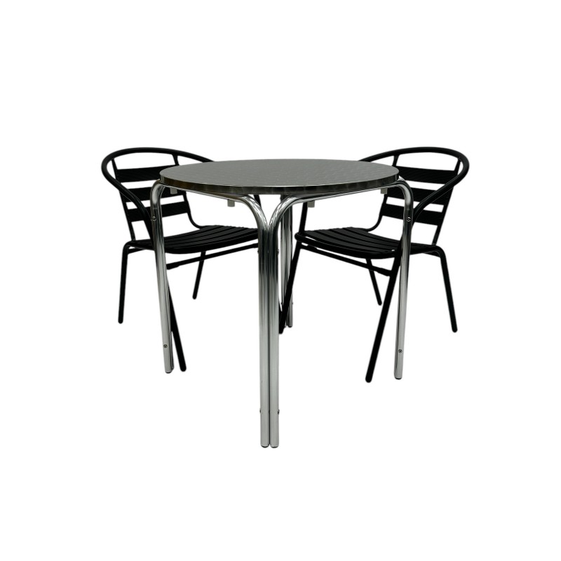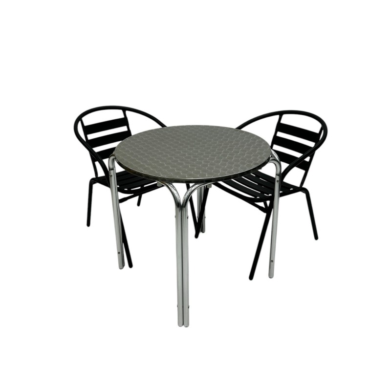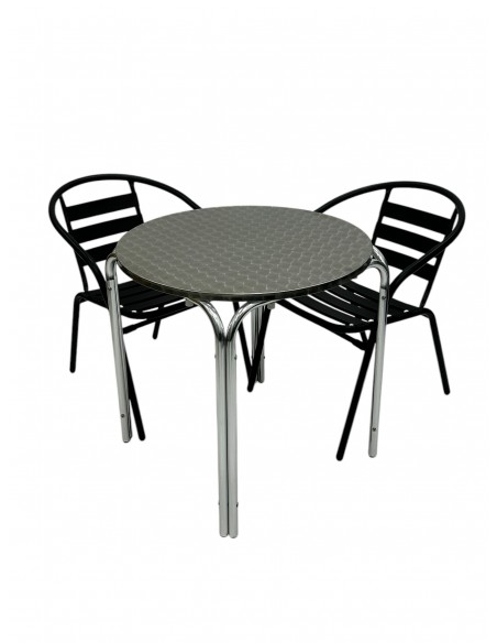 One of our most popular furniture sets, the Black Steel Patio Furniture Set comprising of one 70cm round aluminium stacking table and two of the black steel chairs.