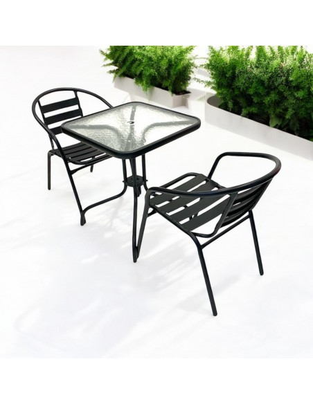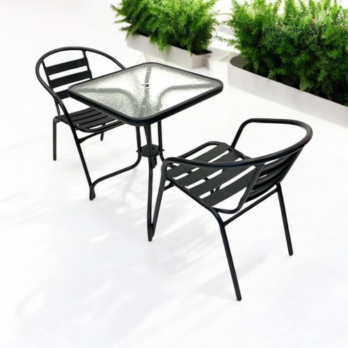 Our BE Furniture Sales Outdoor Balcony Furniture Set comprising of one 60cm square glass bistro table and two of the black steel chairs.