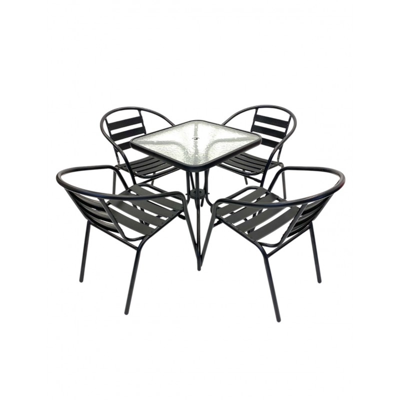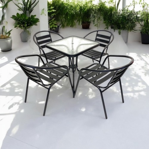 Our BE Furniture Sales Outdoor Garden Furniture Set comprising of one 60cm square glass bistro table and four of the black steel chairs.