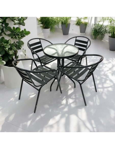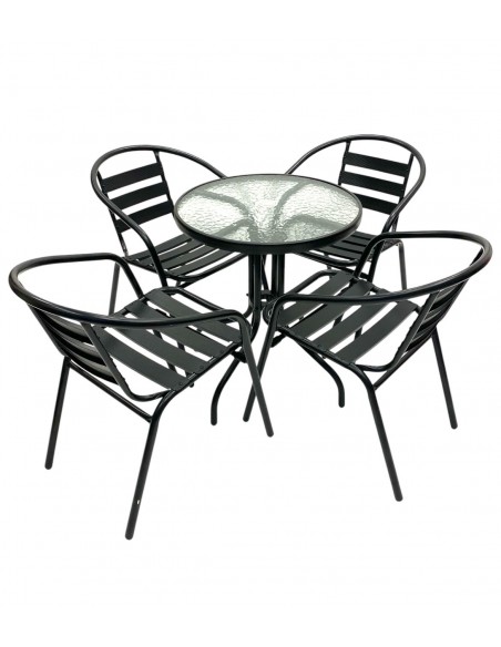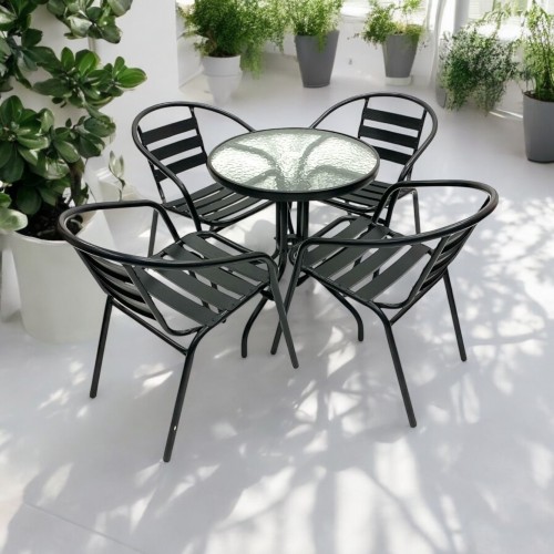 Our BE Furniture Sales Black Garden Patio Set comprising of one 60cm round glass bistro table and four of the black steel chairs.