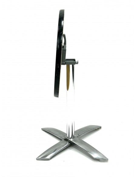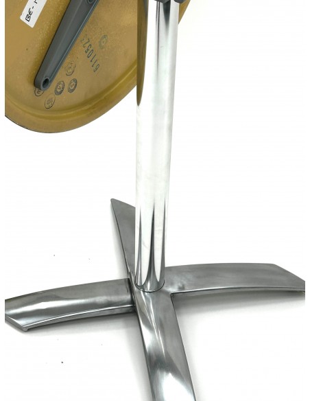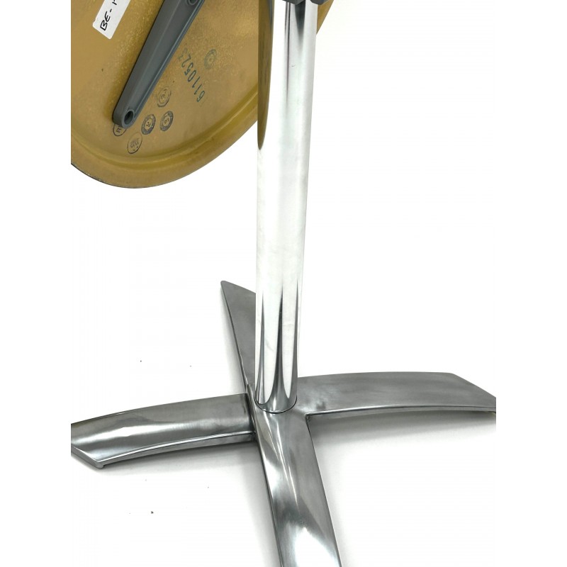 These bases stand 73 cm tall, have a flip down top that locks into position with 4 legs that are offset in height so the tables can be stacked into each other. Each leg also has an adjustable rubber foot inside.