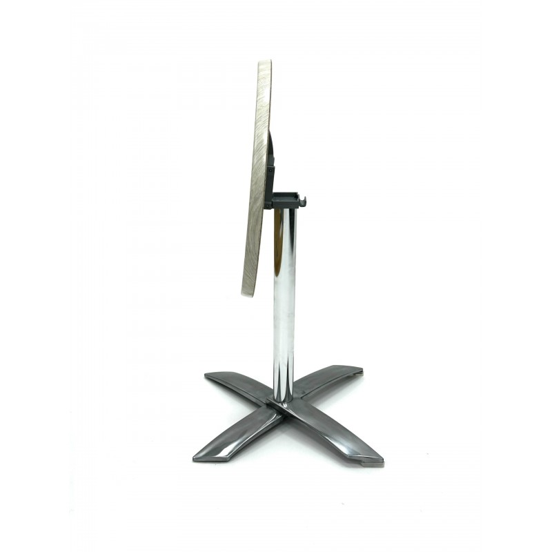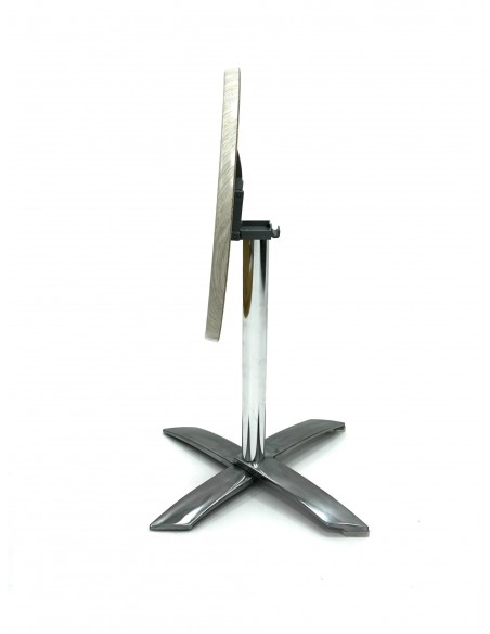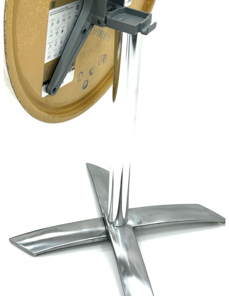 These bases stand 73 cm tall, have a flip down top that locks into position with 4 legs that are offset in height so the tables can be stacked into each other. Each leg also has an adjustable rubber foot inside.