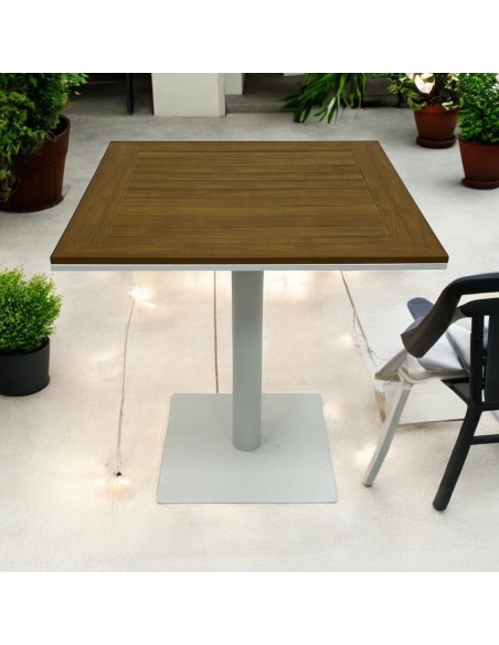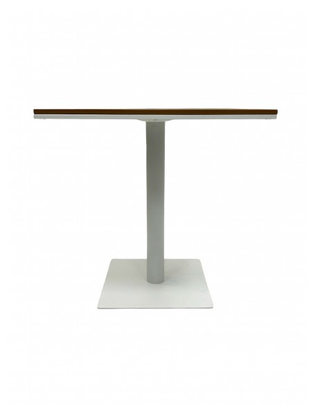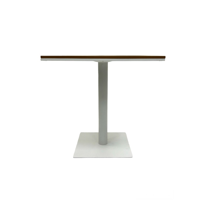 Our BE Furniture Square Pedestal Bistro Table, with a 70 cm square poly wood table top and a white steel weighted base and upright.
