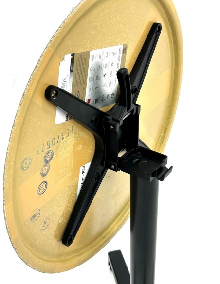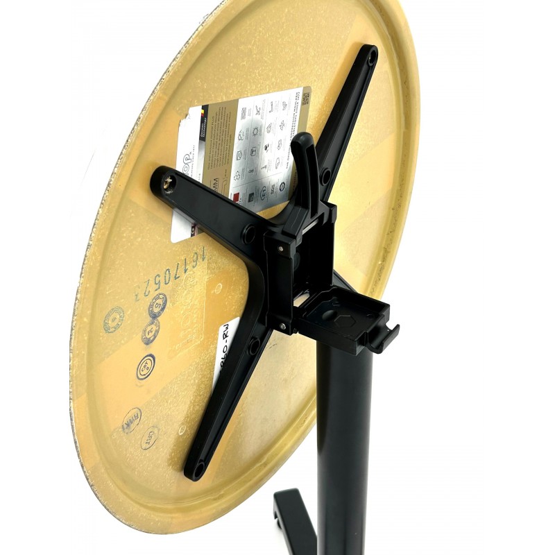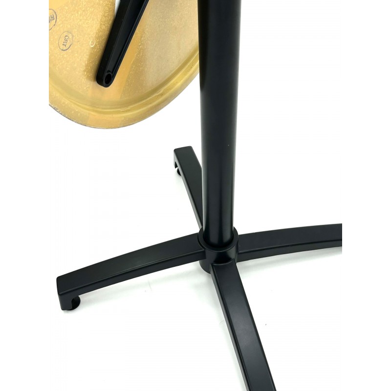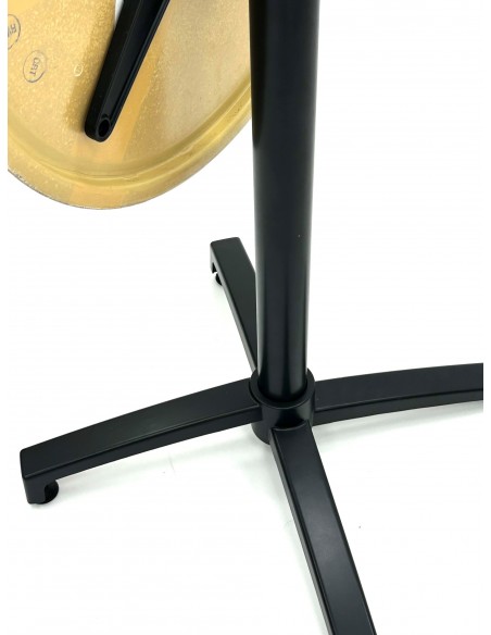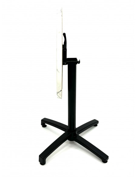 These bases stand 73 cm tall, have a flip down top that locks into position with 4 legs that are offset in height so the tables can be stacked into each other. Each leg also has an adjustable rubber foot inside.