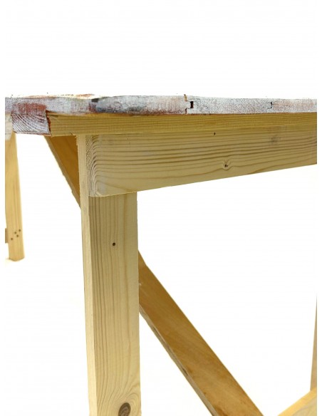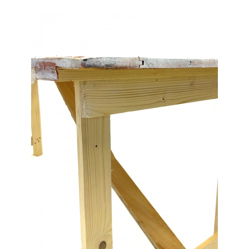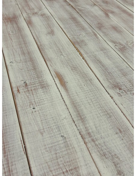 These wooden trestle tables are the work horse of the events industry and venues around the country and comfortably seats 6 people (3 down each side). Each table has a 2cm thick tongue and groove wooden table top, strong folding wooden legs that lock out securely with a wooden hinge and stacking battens. These wooden distressed tables have been painted with a limewash style finish to give them a distressed / Shabby Chic look which is perfect for weddings and themed events.
