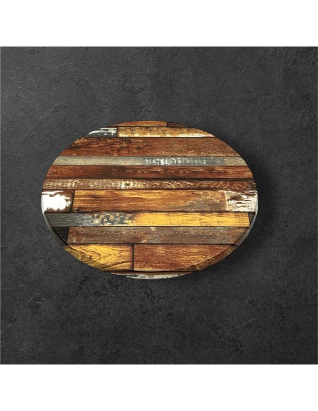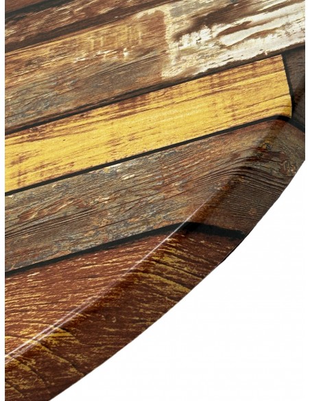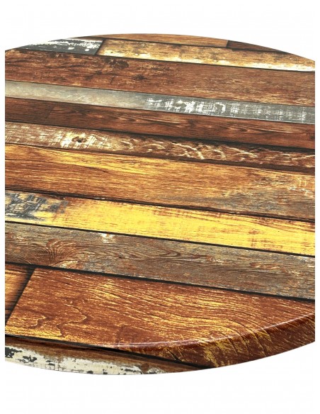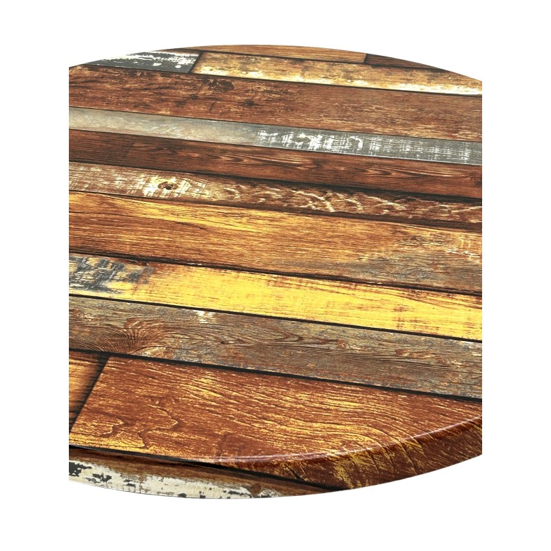 Each cafe table top is 3 cm deep around the edge and 1.7 cm deep on the centre and is fully weatherproof so fine to be used indoors and outdoors all year round. These table tops are also scratch resistant, stain resistant and high temperature resistant making this product perfect for use in cafes and restaurants just as much in and around the home and garden. The finish on these table tops is a used wood effect finish but the table tops do have a smooth finish.