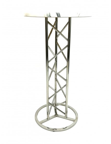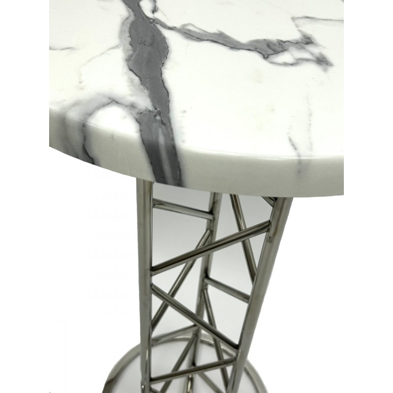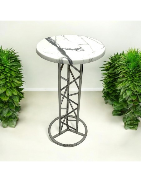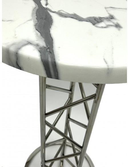 Brand New 60 cm diameter Hollywood High table with a Romeo White Marble table top and a stainless steel silver truss frame table base.