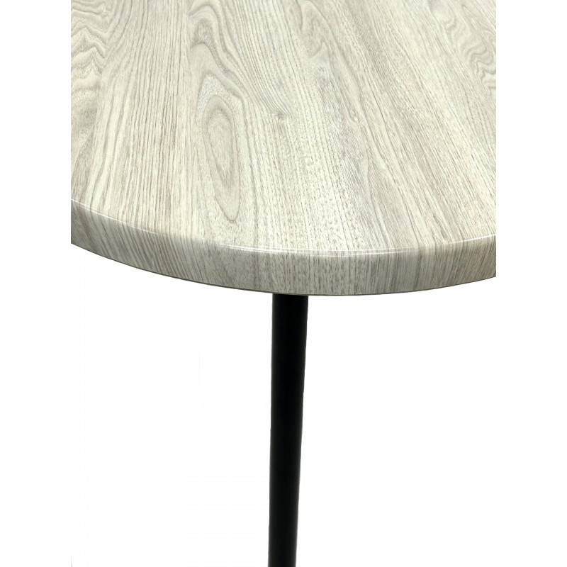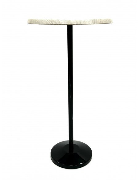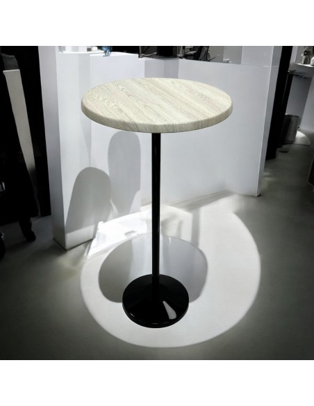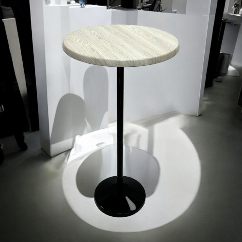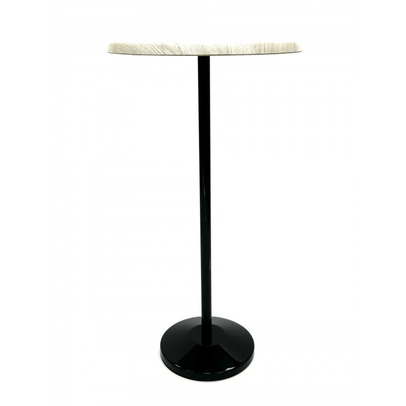 Brand New 60 cm diameter Mistral High table with a White Driftwood table top and a black pedestal table base.