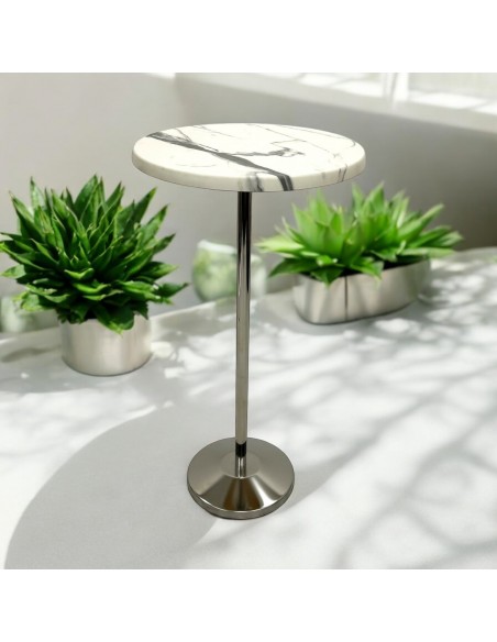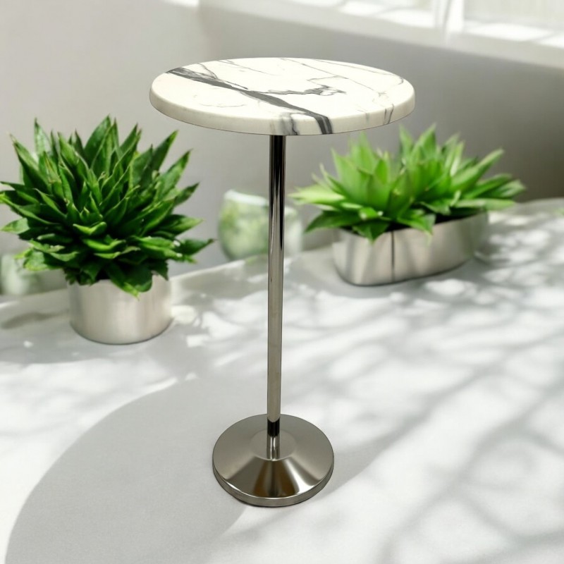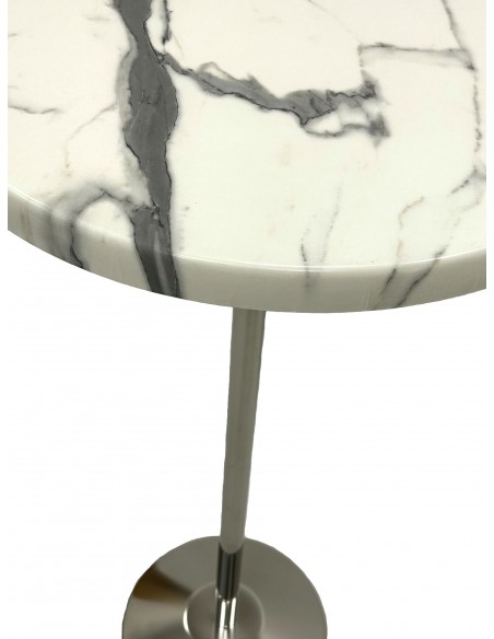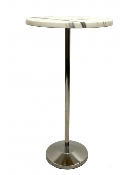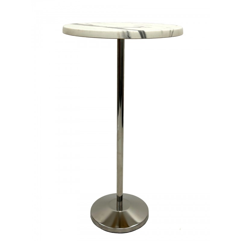 Brand New 60 cm diameter Rivazza High table with a Romeo White Marble table top and a stainless steel silver pedestal table base.
