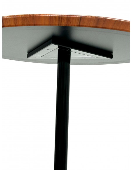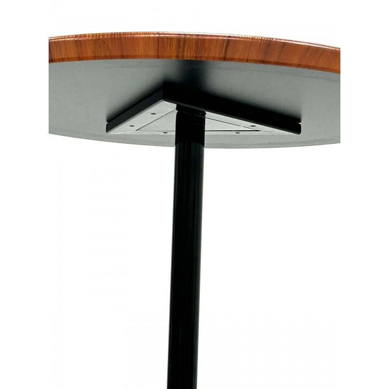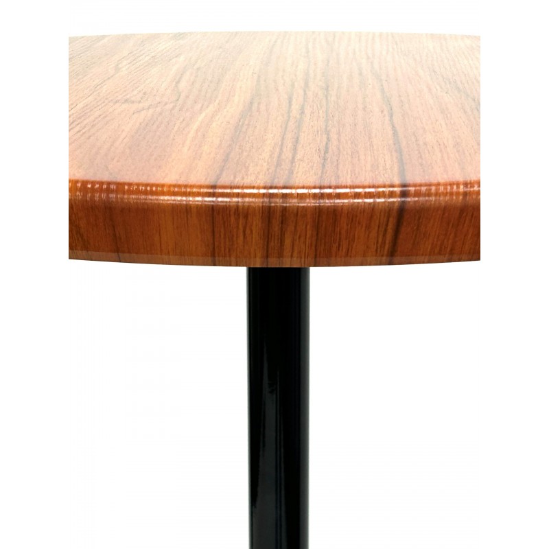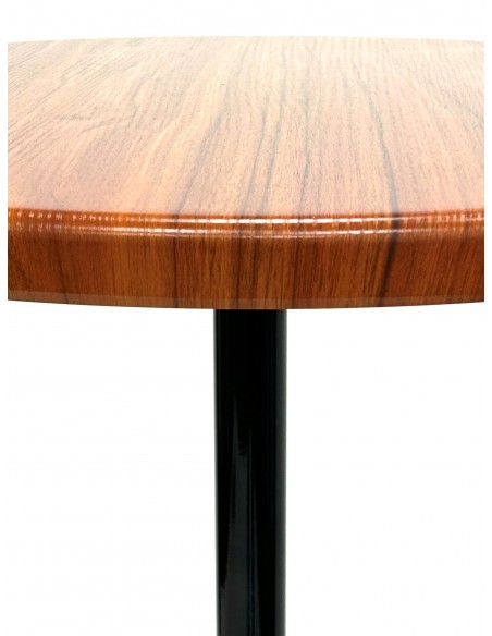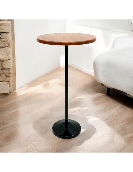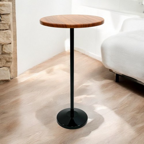 Brand New 60 cm diameter Vale high table with a Mid Wood Effect table top and a black metal pedestal base.