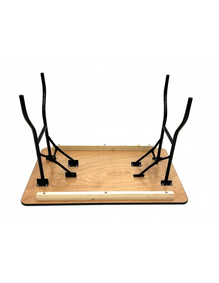 These varnished wooden tables are the work horse of hotels and event venues around the country and comfortably seats 4 people (2 down each side). Each table has a 2cm thick one piece varnished plywood table top, strong folding metal legs with rubber feet, stacking battens and a rubber edge around the table top.
